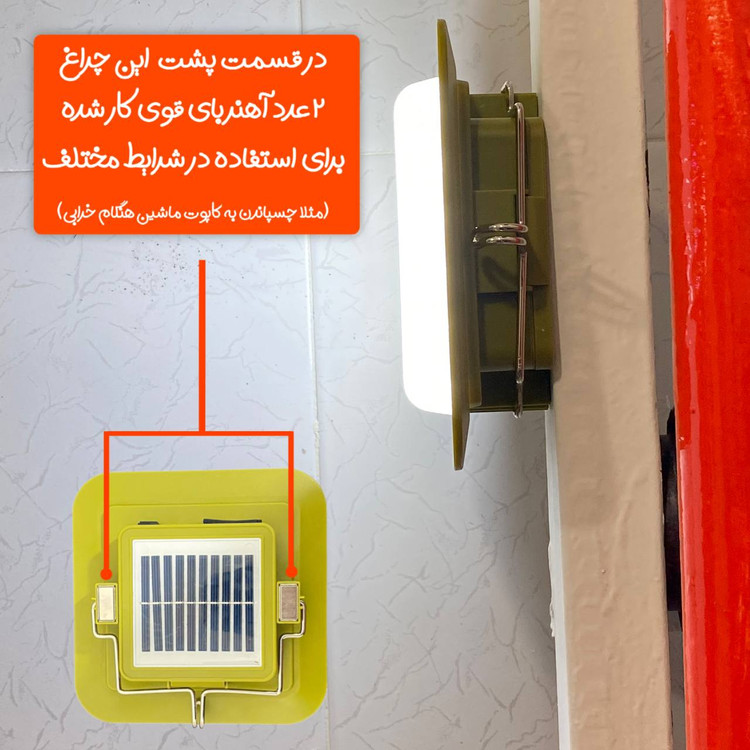 🧲 مگنت قوی و دستگیره آویز: نصب آسان روی کاپوت ماشین، چادر و سطوح فلزی