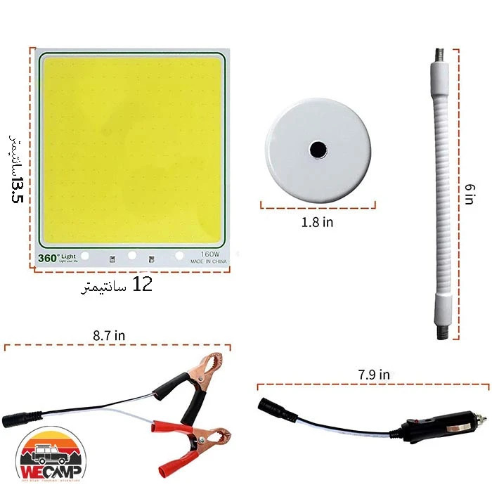 چراغ کمپی سیار ماشینی 360 لایت مدل TM-08 با توان مصرفی 160 وات و توان ورودی 12 ولت، مناسب برای استفاده در کمپینگ و شرایط مختلف. این چراغ دارای بدنه آلیاژی از آهن و آلومینیوم، مقاومت در برابر آب و دمای رنگ 6000 کلوین است. قابلیت تنظیم نور به حالت چشمکزن و محدوده عملکرد دمایی از 0 تا 40 درجه سانتیگراد دارد.
