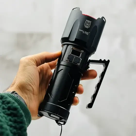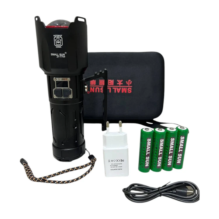 چراغ قوه زومدار اسمال سان مدل zy-t709 با برد نور 1000 متر می باشد و دارای 4 حالت نوردهی می باشد . و با قدرت روشنایی 4500 لومن می باشد . و با قابلیت زوم که واضح 1000 متر رو میزند و در حالت پخش نوری 200 تا 400 متر را کاملا روشن می کند . و دارای صفحه نمایشگر شارژ میباشد که دقیقا نشان می دهد درصد شارژ چراغ قوه چقدر باقی مانده و وقتی که درصد شارژ چراغ قوه به 20 درصد آمد حتما حتما باید به شارژ بزنید و تا 100 درصد کامل کامل شارژ بشود و برای این لازم است حداقل 2 کامل کامل به شارژ وصل شده باشد . و این چراغ قوه دارای 2 تا دکمه پاور یکی برای عوض کردن حالت های نوردهی و یکی فقط برای روشن کردن حالت چشمک زن می باشد . و این چراغ قوه اسمال سان مدل zy-t709 دارای 4 عدد باتری اصلی هک شده اسمال با سایز 18650 2400 میلی آمپر رنگ سبز می باشد . و اقلام این چراغ قوه : یک عدد دکمه یدک ، ورینگ و کش و غیره میباشد و باتری های این چراغ قوه حداقل تا نزدیک به 4 سال کار میکنند و هیچ عیب و ایرادی پیدا نمیکنند . و این چراغ قوه حتی اگر کم ازش استفاده کنید باید طوی 1 ماه باید حداقل 1 بار به شارژ بزنید چون برای سلامتی باتری و خود چراغ قوه خیلی خوب می باشد . برای اینکه این چراغ قوه زیباتر رونمایی بشود و طرافدار های بیشتر و جذب کند تو کارخانه برای این چراغ قوه از یک کیف حمل فوقالعاده محکم از مدل کیف حمل مدل کیف برزنتی استفاده کرده اند و حتی جعبه خود چراغ قوه خیلی جذاب و خیلی هم محکم می باشد .