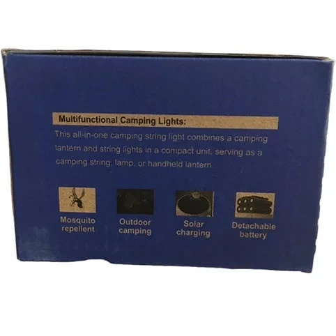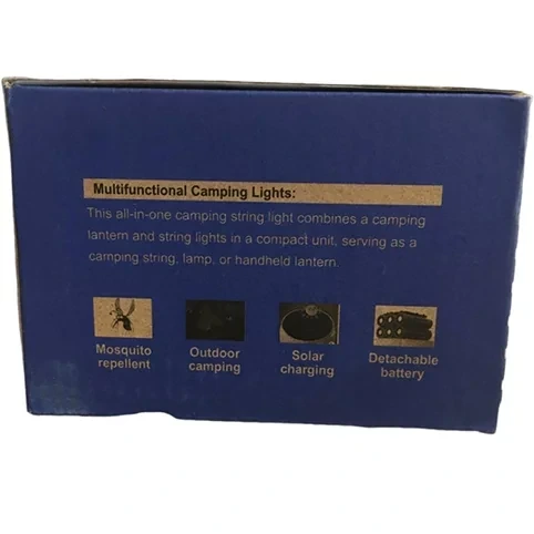 بدنه چراغ از جنس مقاوم و مستحکم ساخته شده و طراحی چند منظوره شامل: دسته نگهدارنده قلاب آویز ریسه نور قابل تنظیم درپوش پورتها باعث راحتی و دوام بیشتر هنگام استفاده میشود. مشخصات فنی چراغ 718-GZY مدل: 718-GY توان: 100 وات نوع طراحی: چراغ دستی آویز ریسه نور تزئینی پاور بانک منبع تغذیه: باتری جدا شونده + شارژ خورشیدی روش شارژ: (57/28) USB + پنل خورشیدی مدت زمان شارژ کامل: 5 تا 10 ساعت چراغ شارژی و کمپینگ چند کاره ضد پشه و پاوربانک دار 100 وات مدل GZY-7187 چراغ شارژی و کمپینگ چند کاره ضد پشه و پاوربانک دار 100 وات مدل GZY-7187 ویژگی خاص: دفع پشه ضد حشرات) کاربردها :کمپینگ سفر کوهنوردی شرایط اضطراری شارژ دستگاه های کوچک نقاط قوت شارژ خورشیدی و USB با باتری جدا شونده قابلیت استفاده به عنوان پاور بانک توان روشنایی بالا 100 وات سیستم دفع پشه برای محیطی آرام طراحی چند منظوره با چراغ دستی آویز بدنه مقاوم و با دوام