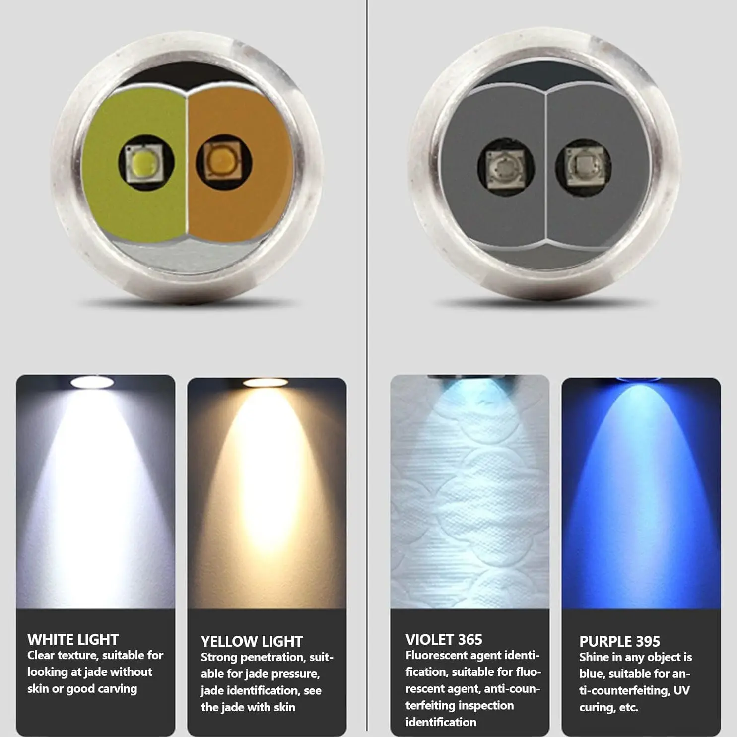 چراغ قوه UV اسمال سان مدل ZY-JY88 دارای 4 لامپ بسیار قوی و شفاف از نوع T6 می باشد که قسمت راست چراغ قوه دارای 2 لامپ به رنگ های سفید و زرد است که هر کدام نیز دارای 2 حالت نوردهی قوی و ضعیف هستند قسمت چپ چراغ قوه نیز دارای لامپ یو وی است این چراغ قوه UV اسمال سان مدل ZY-JY88 دارای اشعه ی فرابنفش UV است .