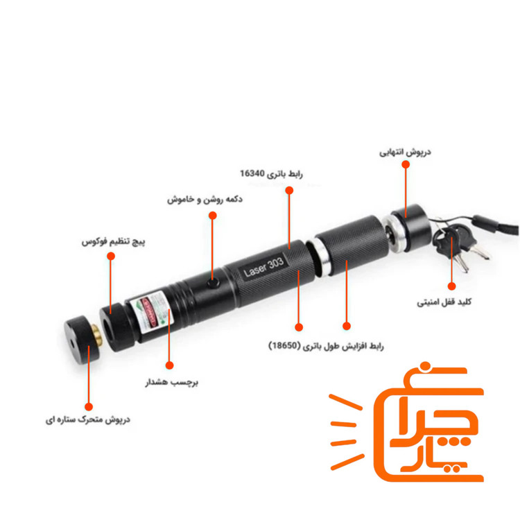 لیزر پوینتر اسمال سان Small Sun مدل ZY 303 منبع تغذیه یک عدد باتری قابل شارژ 18650، دارای دوشاخه متصل جهت اتصال به برق و شارژ مجدد باتری همراه حالت های نوردهی لیزر به صورت اشکال نقطه ای متنوع، به همراه دو عدد کلید جهت قفل کردن لیزر و حفظ ایمنی رنگ نور لیزر سبز، دارای کلید فیزیکی به منظور روشن و خاموش کردن و تغییر حالت نوردهی لیزر توان خروجی کلی 100 میلی وات، طول موج ایجاد شده 532 نانومتر دارای بند جهت پیچیدن دور مچ دست و حمل آسان تر