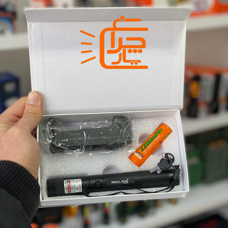 لیزر پوینتر دوربرد اسمال سان | مدل ZY-303 پرتوی سبز قدرتمند با برد فوقالعاده تا 12 کیلومتر با باتری ۲۴۰۰ میلی آمپری اسمال سان و یک عدد شارژر باتری