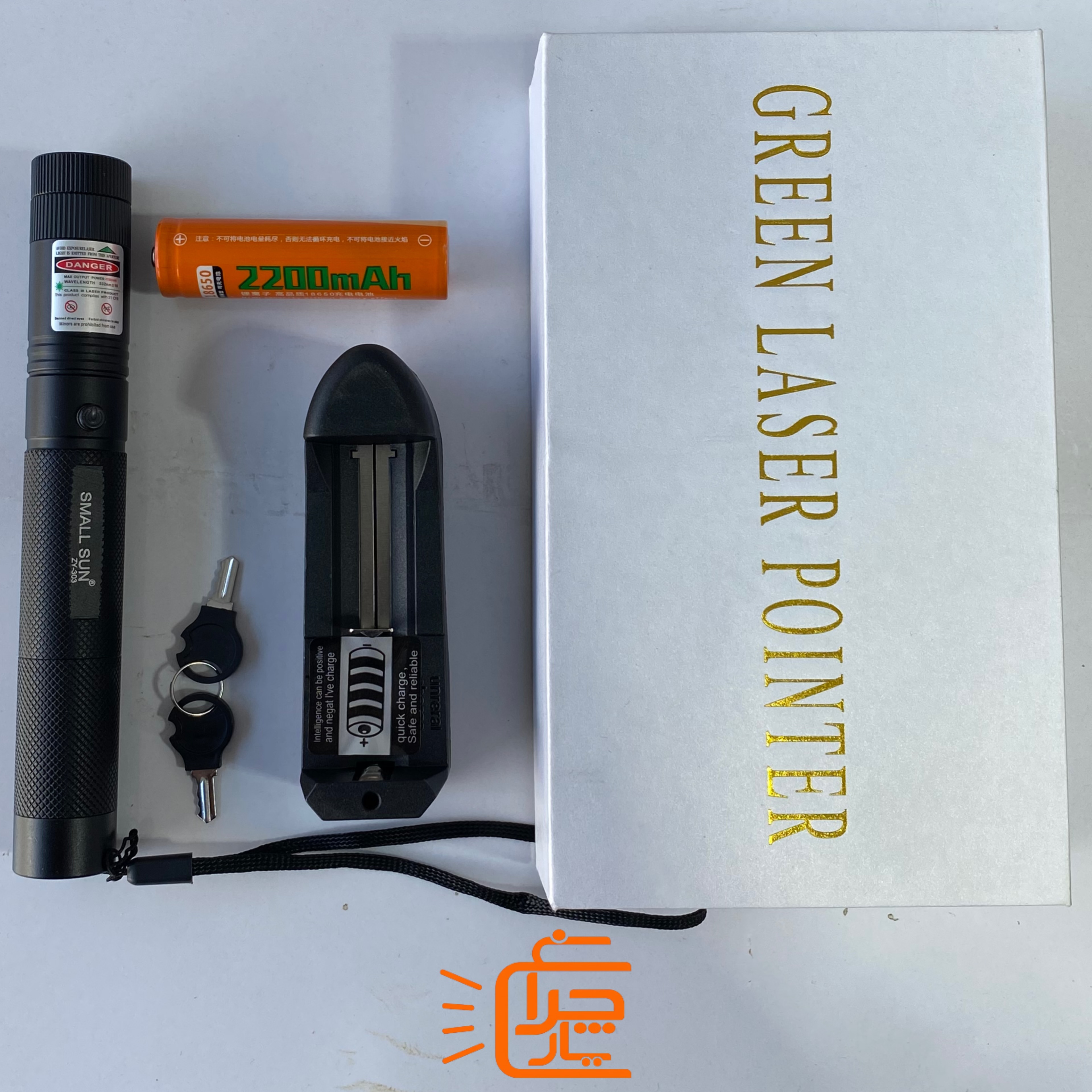 لیزر پوینتر دوربرد اسمال سان | مدل ZY-303 پرتوی سبز قدرتمند با برد فوقالعاده تا 12 کیلومتر با باتری ۲۴۰۰ میلی آمپری اسمال سان و یک عدد شارژر باتری
