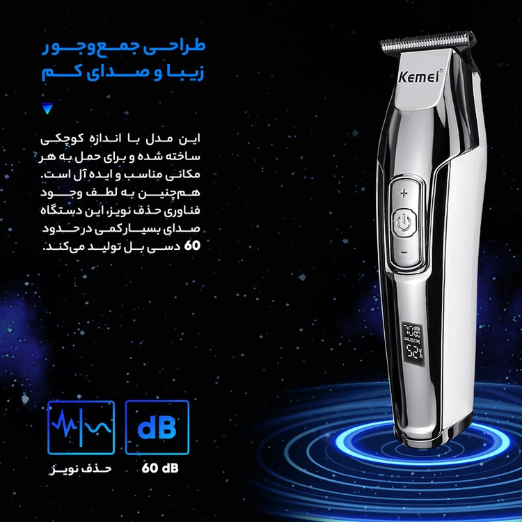همیشه مرتب و اراسته باشید. داشتن ماشیناصلاح ساده و جمعوجور که دارای طراحی ارگونومیک بوده و دست را اذیت نکند از واجبات است. ماشین اصلاح کیمی مدل KM-5027 یکی از پرقدرت ترین و ریزترین حالت اصلاح را دارد. با این دستگاه میتوانید اصلاح از شماره 0 تا شماره 3 را داشته باشید. کیمی مدل km-5027 تنها دستگاهی است که با 2 ساعت شارژ فول شارژ شده و میتوانید 240 دقیقه بدون سیم از دستگاه استفاده کنید. این دستگاه کم صدا و پر قدرت هم برای اصلاح در خانه و هم برای سالنهای آرایشگاهی مناسب است. درصد شارژ دستگاه به صورت نمایش عددی LCD است و شما میتوانید به وسیله باتری قابل شارژ آن را شارژ کنید. از نقاط ضعف این دستگاه نداشتن قابلیت شستوشو آن است. . کیمی مدل km-5027 تنها 150 گرم وزن داشته و دست را در استفاده طولانی خسته نمیکند. گفتنی است همراه محصول 3 عدد شانه نیز ارائه میشود.